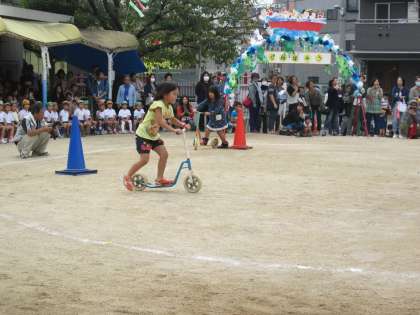 平均台、スクーターを使ったリレーに挑戦です。
