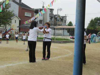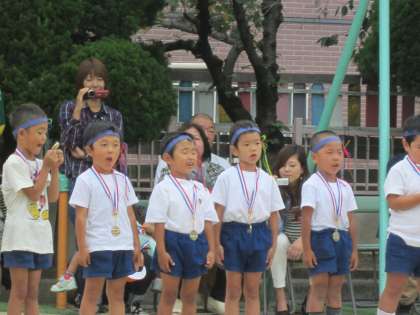 閉会式では、園長先生から、感無量の言葉があり、最後に園児全員に、がんばったご褒美に金メダルが贈られました。