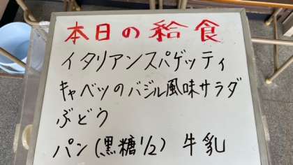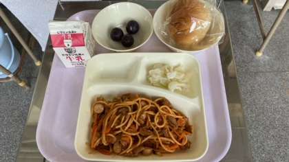 今日の給食は、イタリアンスパゲッティ、キャベツのバジル風味サラダ、ぶどうです。パンは黒糖パン2分の1の大きさです。
