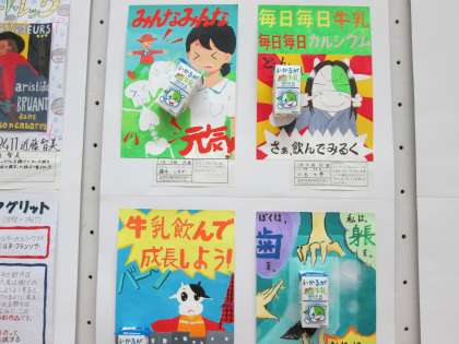 給食の牛乳パックを活かした標語絵。