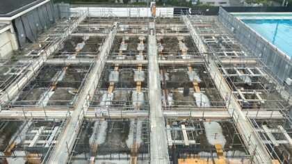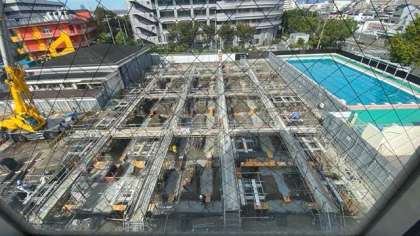 大型重機を駆使して、体育館の柱になる鉄の芯を運んでいます。もうすぐ、地中の梁の部分が出来上がります。