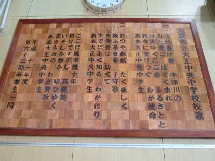 体育館に掲げられた大正中央中の校歌。2番の出だしに、♪打つや鉄鉱、たくましく・・・。歴史を感じる歌詞です。