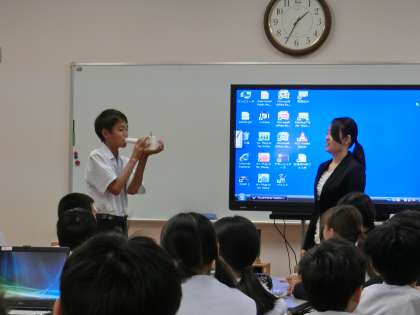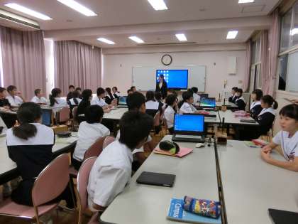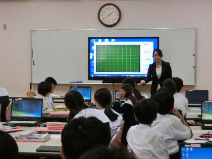 1年の公開授業。電子黒板やコンピュータ。そして、生徒たちの手にはタブレットが。
