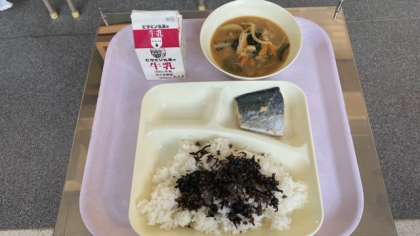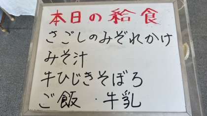 今日の給食は、さごしのみぞれかけ、味噌汁、牛ひじきそぼろです。