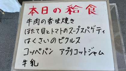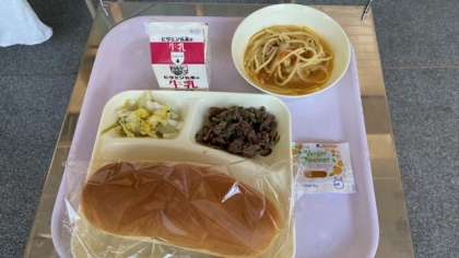 今日の給食は、牛肉の香味焼き、ホタテ貝とトマトのスープスパゲッティ、白菜のピクルスです。パンにはアプリコットジャムがつきます。