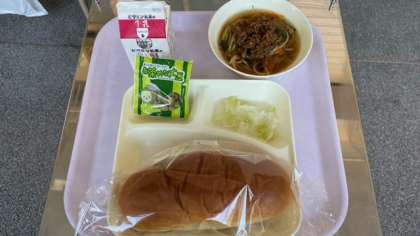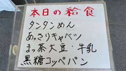 今日の給食は、坦々麺、あっさりキャベツ、抹茶大豆です。パンは黒糖パンです。