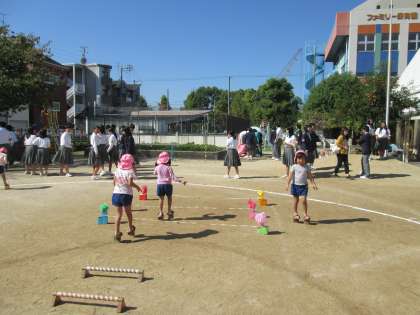 秋晴れの中、園庭での遊びが始まりました。