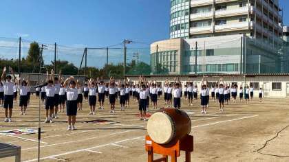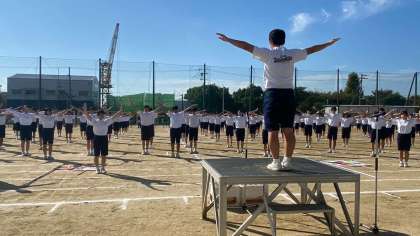 続いてラジオ体操です。代表の生徒がステージの上で上手に見本を見せます。太ももを叩く音がまとまって響きます。