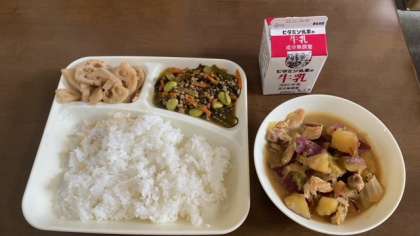 今日の給食は、もずくと豚ひき肉のジューシー、サツマイモの味噌汁、焼きレンコンです。