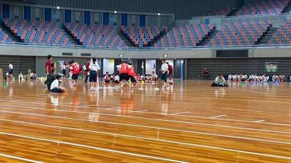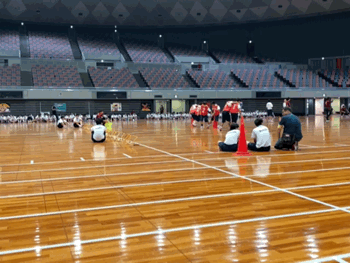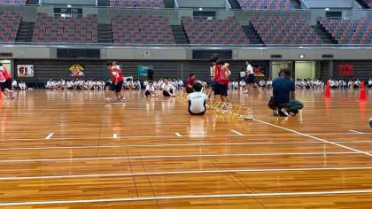 プログラム4番、二人三脚です。まずは1年生です。しっかりタイミングを合わせて走りましょう。