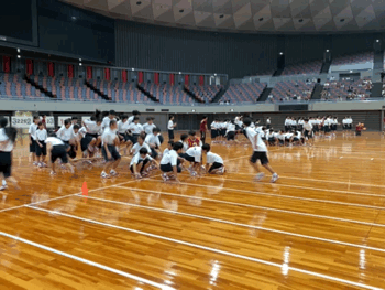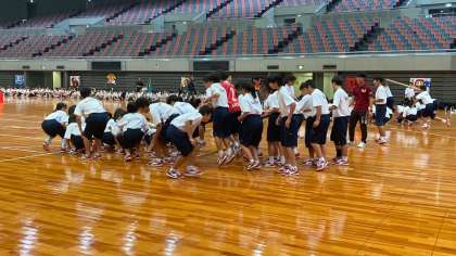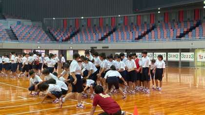 クラスに戻ってきたら、竹の棒を足元をジャンプでくぐらせて頭上を通って、次の人にバトンタッチ!