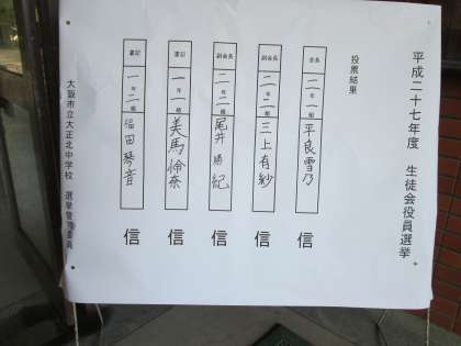 先週の生徒会立会演説会・選挙の開票結果が発表され、5名全員が信任投票で役員に当選いたしました。おめでとうございます。