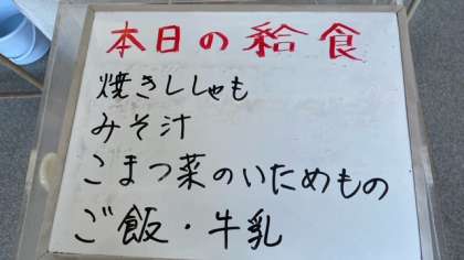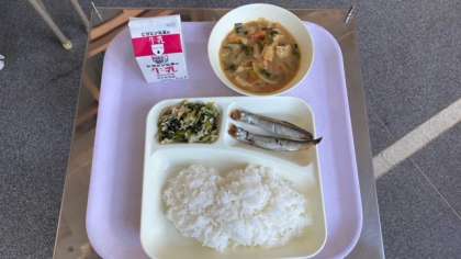 今日の給食は、焼きししゃも、味噌汁、小松菜の炒め物です。