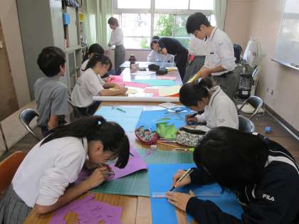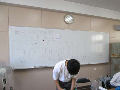 文化祭のスローガン、舞台のパネルづくりです。新旧メンバーが協力しています。