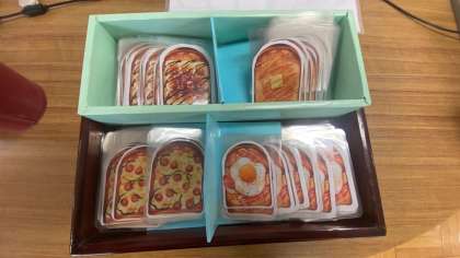 お昼休みの図書室では、本の貸し出しを進めています。今週からは、お手製の4種類のしおりを本を借りた生徒に1つずつお渡しすることになっています。