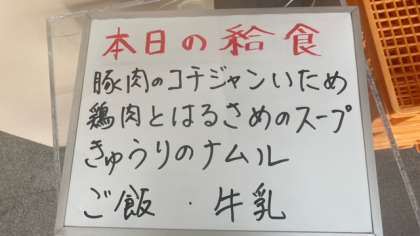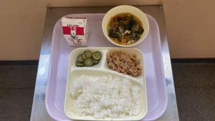 今日の給食は、豚肉のコチジャン炒め、鶏肉と春雨のスープ、きゅうりのナムルです。