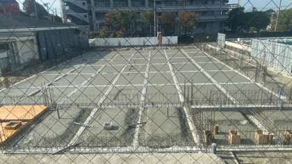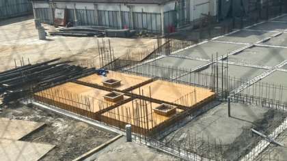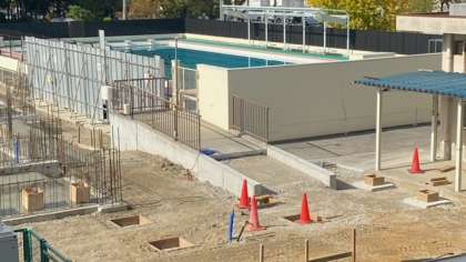 体育館の建て替え工事は、1階の床となる部分が見えてきました。また、トイレの部分も土台ができてきたようです。プールは、スロープの部分が引き直しとなっているようです。