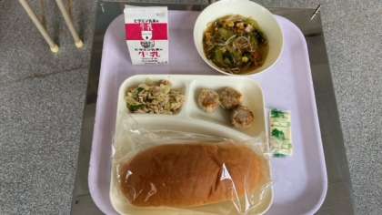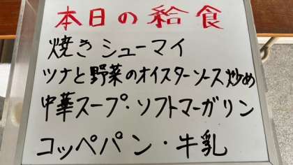 今日の給食は、焼きシューマイ、中華味噌スープ、ツナと野菜のオイスターソース炒めです。