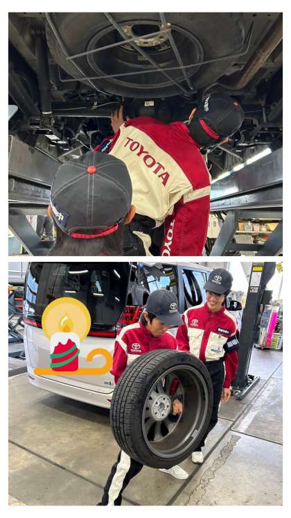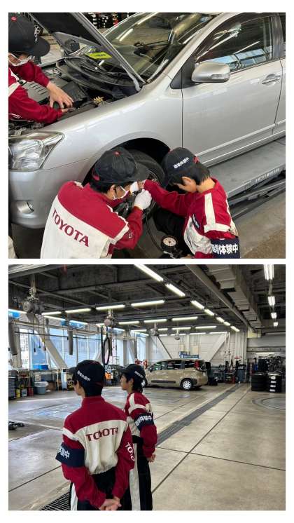 トヨタ自動車株式会社ではタイヤの空気圧の確認や車の裏側を見せていだきました。