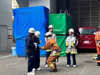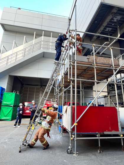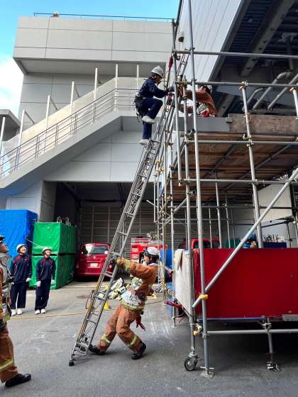 消防士さんの見本を見てから中学生も挑戦し、分かりやすく教えて頂いたお陰でカッコよく登っていました。