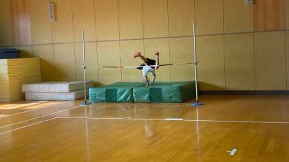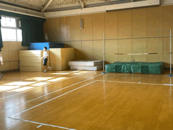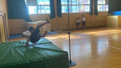 1年生の体育男子では、高跳びを格技室で授業しています。はさみ跳び、ベリーロールなど上手に跳べているようですねー)^o^(