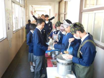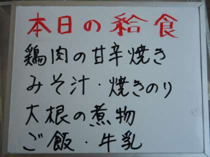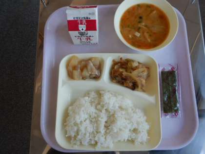 今日の給食は、鶏肉の甘辛焼き、味噌汁、大根の煮物、焼きのりです。