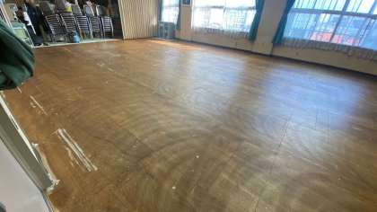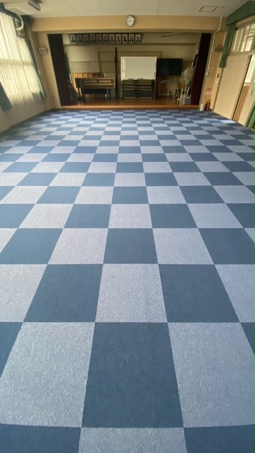 多目的室の床を張り替えました。前は、ベージュの床だったのですが、今回はブルーのカーペットです。