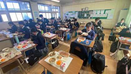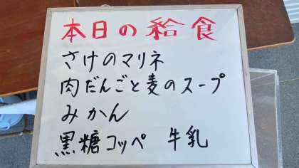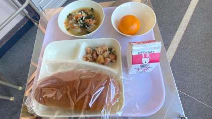 今日の給食は、鮭のマリネ、肉団子と麦のスープ、みかんです。パンは黒糖パンです。