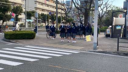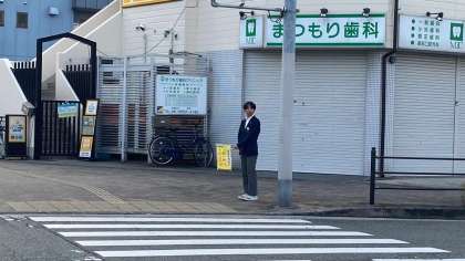 昨日まで学年休業だった1年生も、元気に登校してきています。学校前の交差点では、生徒会の皆さんが交通安全を旗を持って見守りをしてくれています。