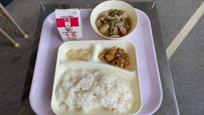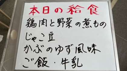 今日の給食は、鶏肉と野菜の煮物、じゃこ豆、かぶの柚子風味です。