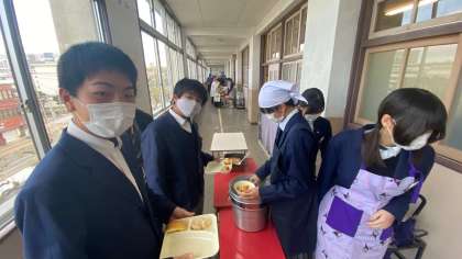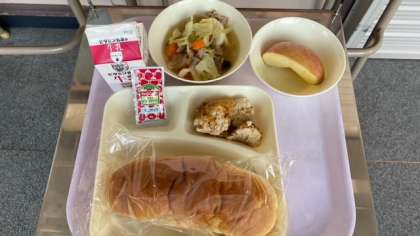 今日の給食は、豆腐ローフ、カリフラワーのスープ煮、りんごです。パンはおさつパンです。