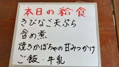 今日の給食は、きびなご天ぷら、含め煮、焼きかぼちゃの甘みつかけです。