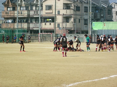 相手のトライから始まる苦しい展開ですが、必死でタックルに!