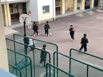 中庭でシュートの練習をしていました。