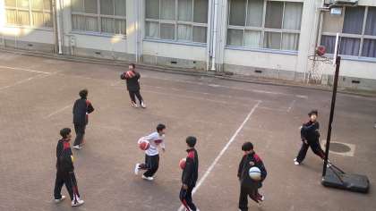 男子バスケット部は、体育館建て替え工事のため、小学校や高校の体育館を借りて活動しています。