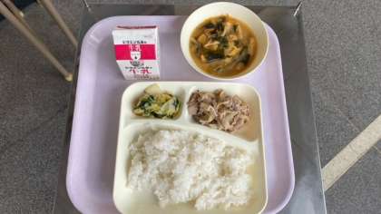 今日の給食は、豚肉のごまだれ焼き、味噌汁、きくなと白菜のおひたしです。