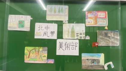 玄関を入ってすぐ、右手に美術部の作品を掲示しています。