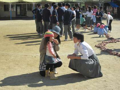 園児さんは、収穫したさつまいもを園庭に並べて、数を数えています。