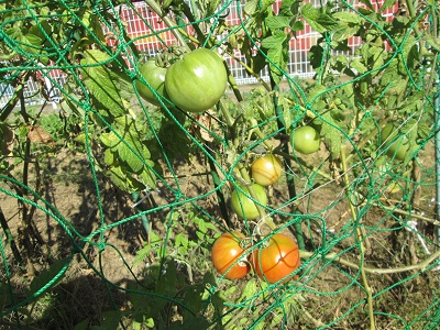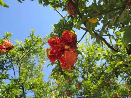 幼稚園の園庭にはザクロが、そして、畑には赤みを帯びたトマトと、大根がたくさんできていました。