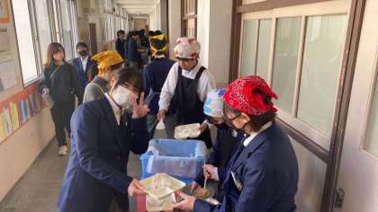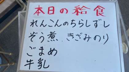 今日の給食は、レンコンのチラシ寿司、雑煮、ごまめです。