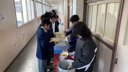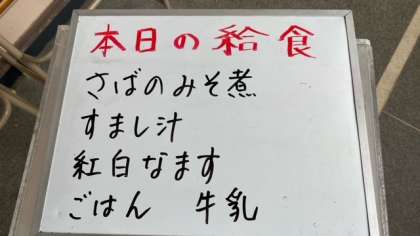 今日の給食は、鯖の味噌煮、すまし汁、紅白なますです。