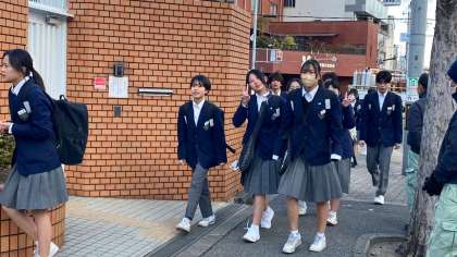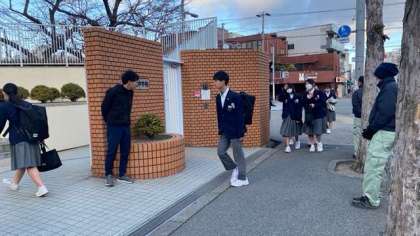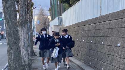 今朝は、雪が舞い散る中での登校となりました。防寒具を使用しての登校です。風が冷た〜い>_<