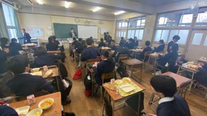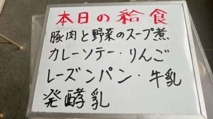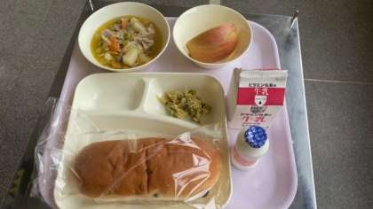 今日の給食は、豚肉と野菜のスープ煮、カレーソテー、りんご、発酵乳です。パンはレーズンパンです。