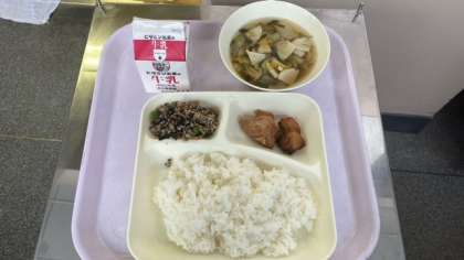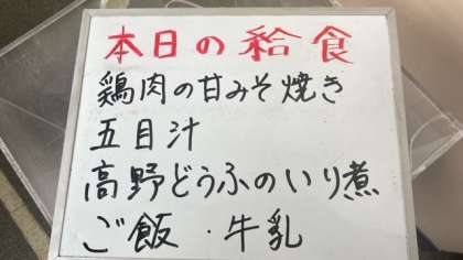 今日の給食は、鶏肉の甘味噌焼き、五目汁、高野豆腐の炒り煮です。