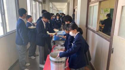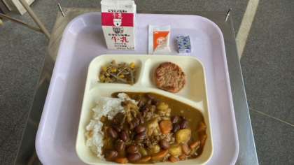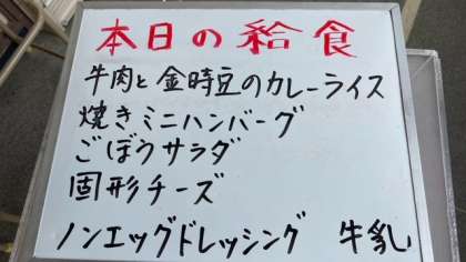 今日の給食は、金時豆のカレーライス、焼きハンバーグ、ごぼうサラダ、固形チーズです。