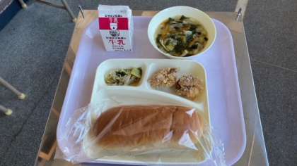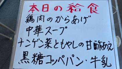 今日の給食は、鶏肉の唐揚げ、中華スープ、青梗菜ともやしの甘酢和えです。パンは黒糖パンです。