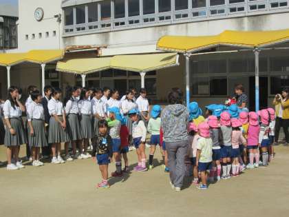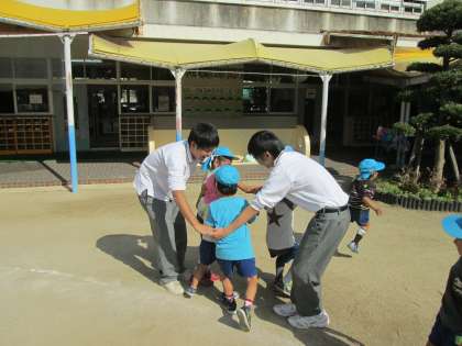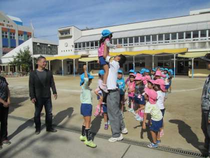 花道を通って、お別れです。最後の男子が、園児さん一人一人を抱っこして「高い高い」! 大サービス!