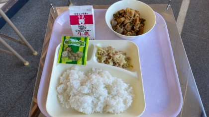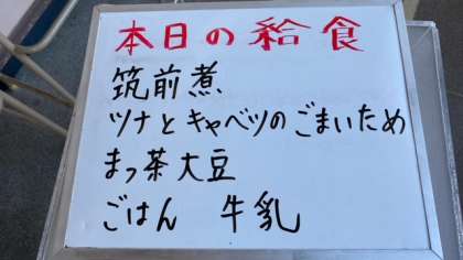今日の給食は、筑前煮、ツナとキャベツの胡麻炒め、抹茶大豆です。