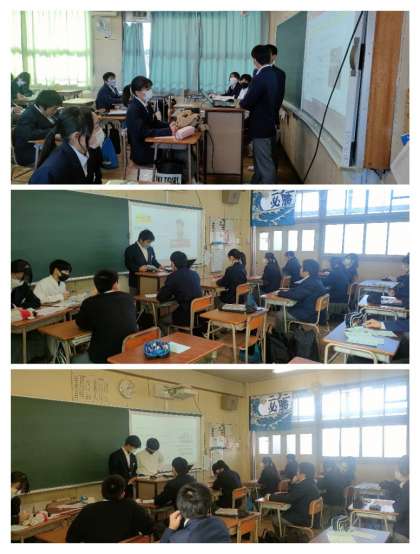 総合の時間に2年生が1年生に向けて職場体験の発表を行いました。