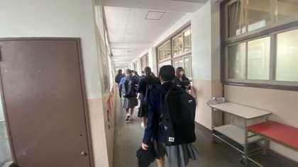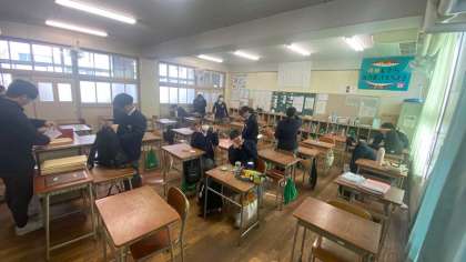 教室で諸注意を受けて、志願書の記載事項を最終確認。遠い学校から出発します。